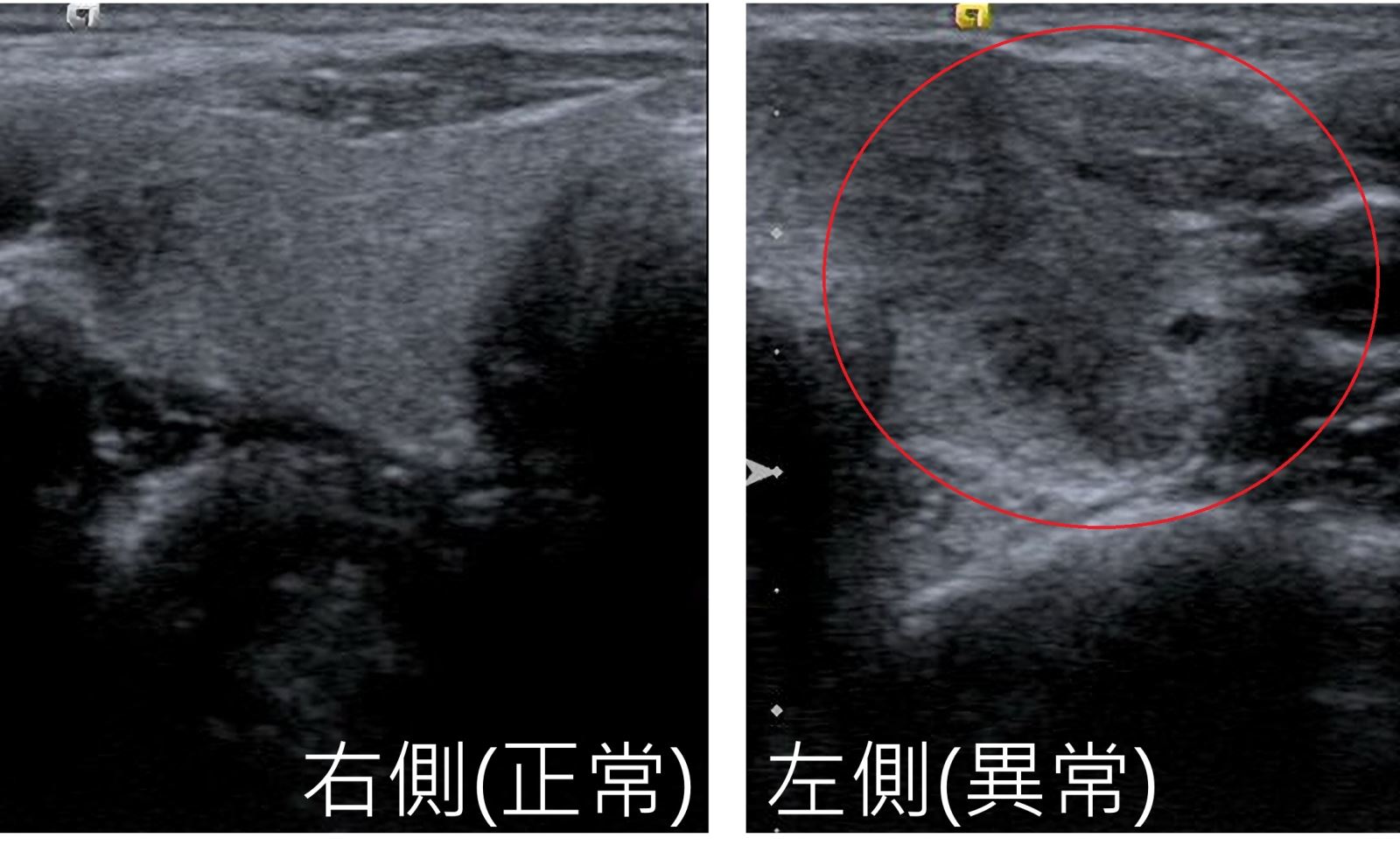 當下先用手觸摸脖子,發現她的左側甲狀腺有硬的腫塊及明顯壓痛,安排抽血檢查,紅血球沉降指數(ESR)57(正常< 20)、甲狀腺功能TSH 0.016 (正常0.34-5.6)以及freeT4 2.6(正常0.54-1.4)異常,顯示有甲狀腺毒血症,於是再安排甲狀腺超音波檢查,發現左側甲狀腺有一大片邊界不清楚且內部不均勻的低回音(圖2),確診為亞急性甲狀腺炎。