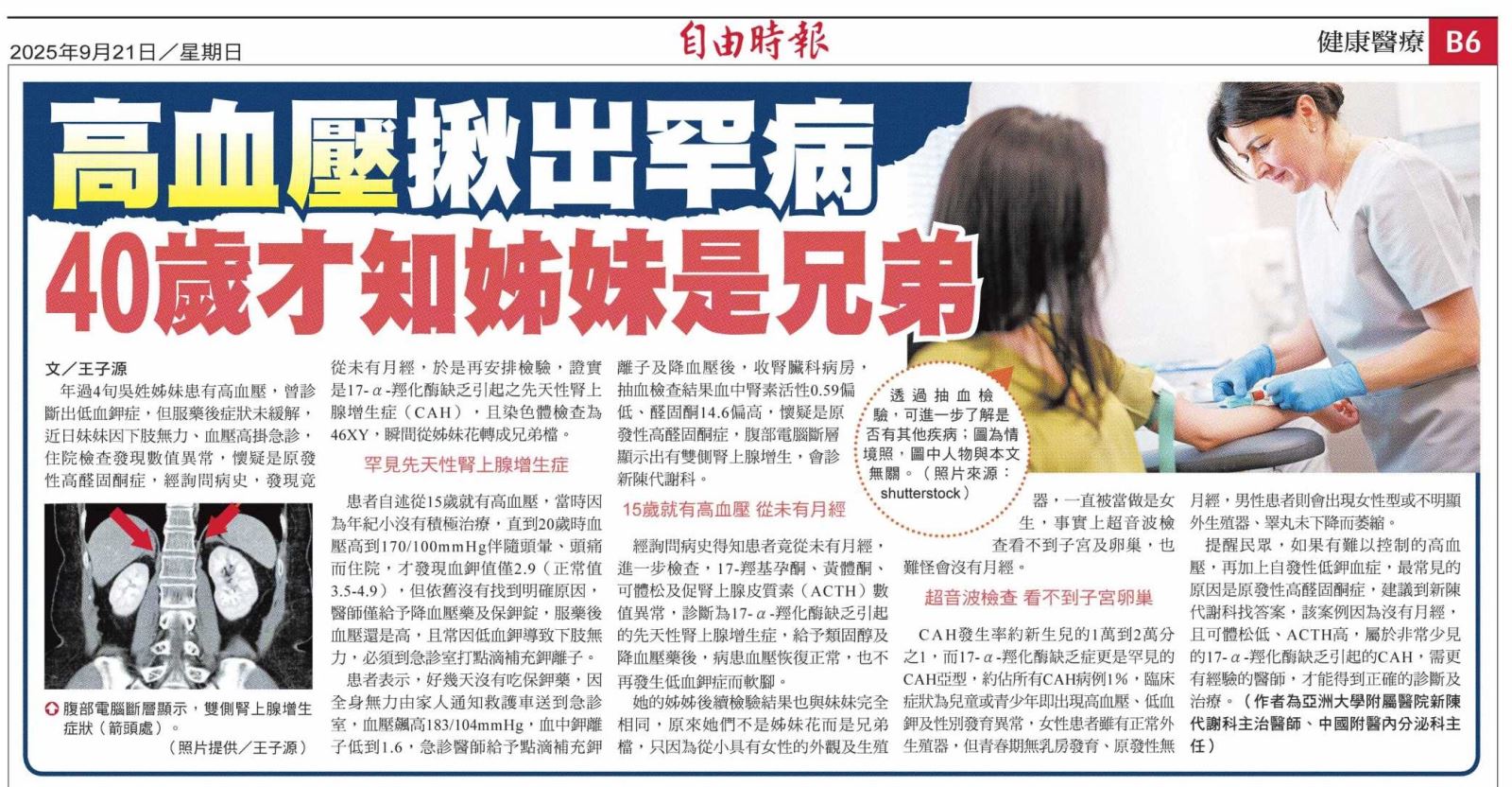 ►自由時報 :高血壓揪出罕病 40歲才知姊妹是兄弟