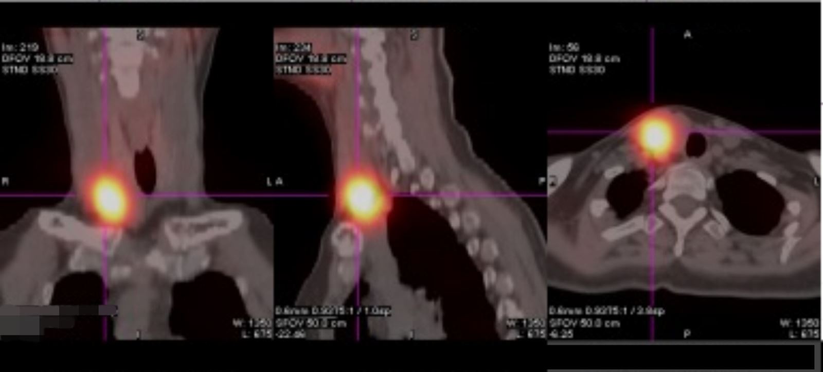 60歲陳姓阿姨近兩年來爆瘦10公斤,卻始終找不到原因,經轉診來院抽血檢查,發現有高血鈣且副甲狀腺荷爾蒙(iPTH)飆高,安排甲狀腺超音波檢查後,果然查出1顆腫瘤(圖一),核子醫學掃描也顯示為功能性副甲狀腺瘤(圖二),確診為原發性副甲狀腺機能亢進(簡稱原發性副甲亢),安排手術切除後,病理報告為罕見副甲狀腺癌,手術後恢復良好,體重也逐漸上升。
