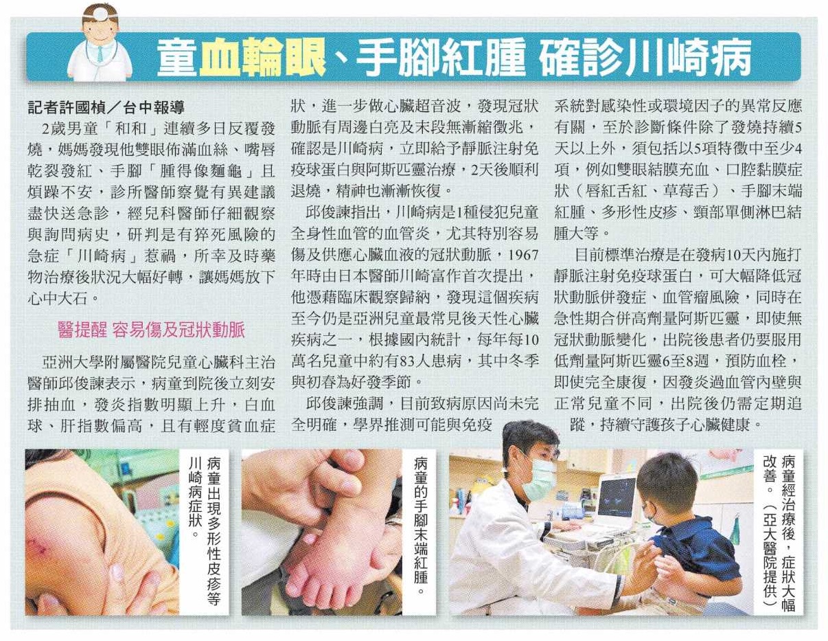 亞洲大學附屬醫院兒童心臟科主治醫師邱俊諫表示,病童到院後立刻安排抽血,結果顯示發炎指數明顯上升,白血球、肝指數偏高,且有輕度貧血症狀,進一步做心臟超音波時,發現冠狀動脈有週邊白亮及末段無漸縮(lose of tapering)徵兆,確認是川崎病,於是立即給予靜脈注射免疫球蛋白(IVIG)與阿斯匹靈治療,兩天後順利退燒,精神也漸漸恢復。