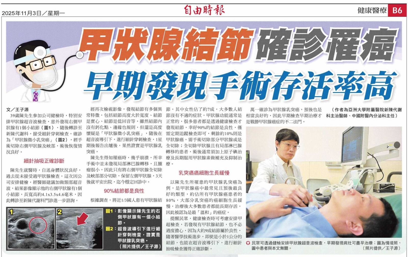 ►自由時報 :甲狀腺結節確診罹癌 早期發現手術存活率高