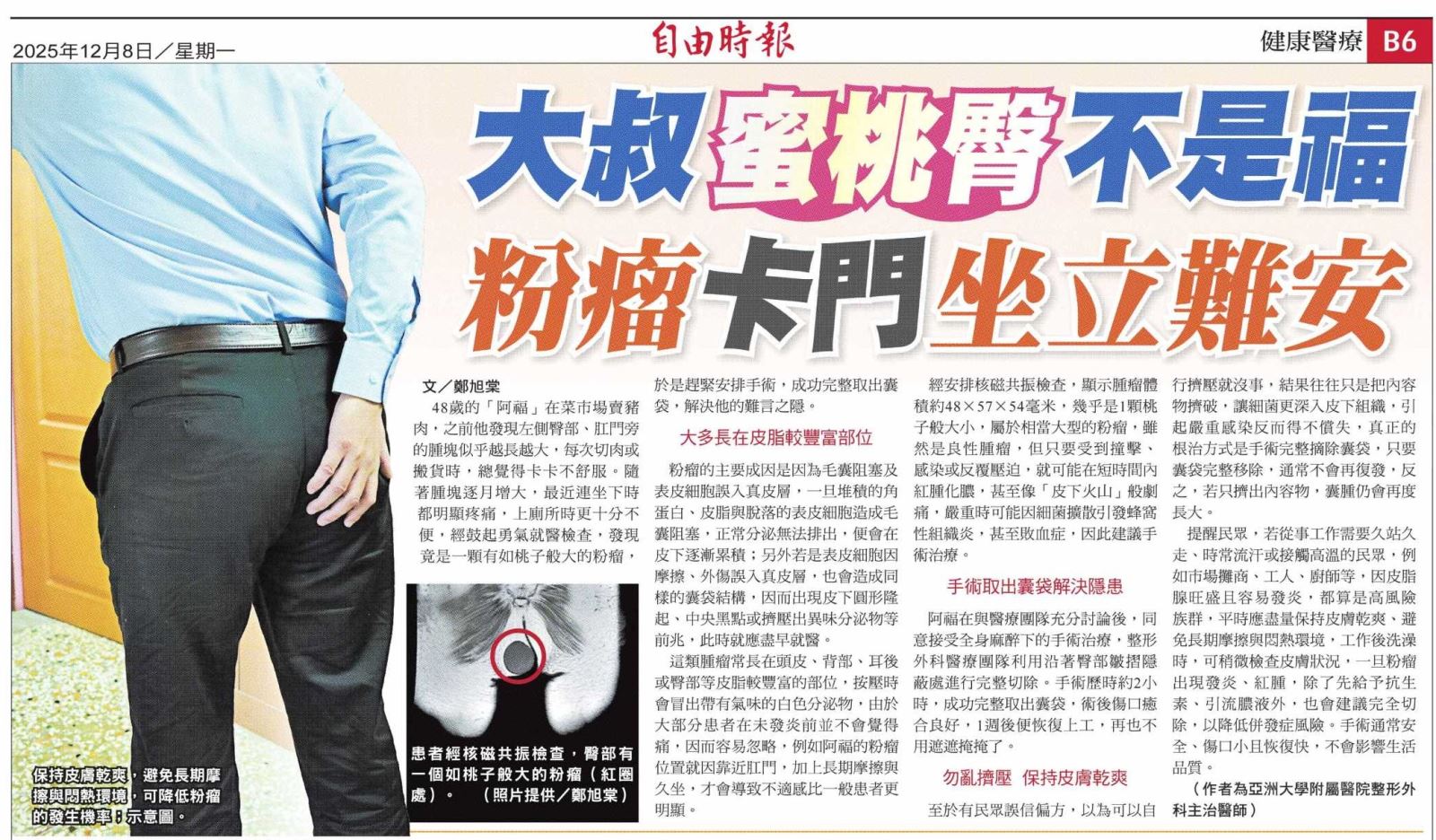 48歲「阿福」在菜市場賣豬肉,之前他發現左側臀部、肛門旁的腫塊似乎越長越大,每次切肉或搬貨時,總覺得卡卡不舒服,隨著腫塊逐月增大,最近連坐下時都明顯疼痛,上廁所時更十分不便,經鼓起勇氣就醫檢查,發現竟是一顆有如桃子般大的粉瘤,於是趕緊安排手術,成功完整取出囊袋,解決他的胯下之苦!