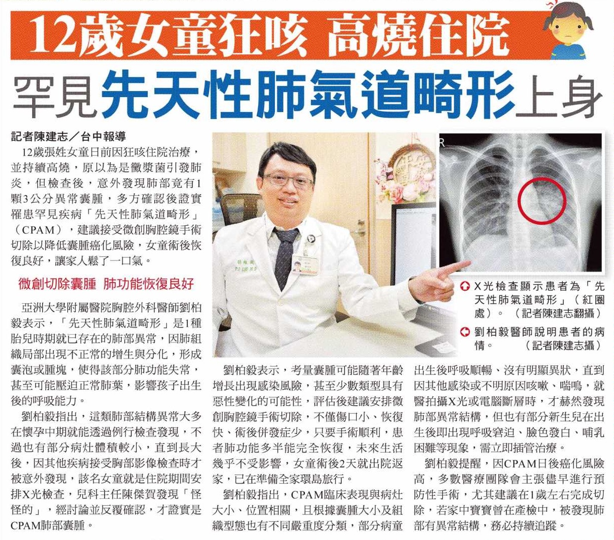 ►自由時報 :12歲女童狂咳 高燒住院 罕見「先天性肺氣道畸形」上身