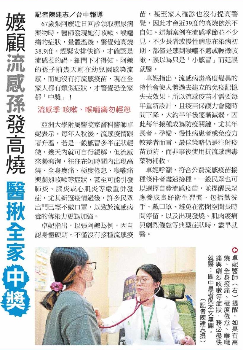 亞洲大學附屬醫院家庭醫學科主治醫師卓妮表示,每年入秋之後,街頭巷尾的空氣彷彿多了一種無形的緊張感,因為無論是走進捷運車廂或者辦公室,往往會聽到咳嗽聲此起彼落,尤其在醫院候診區,戴著口罩、低聲擤鼻涕的人明顯變多,因為這正是流感疫情急遽升溫的警告訊號。