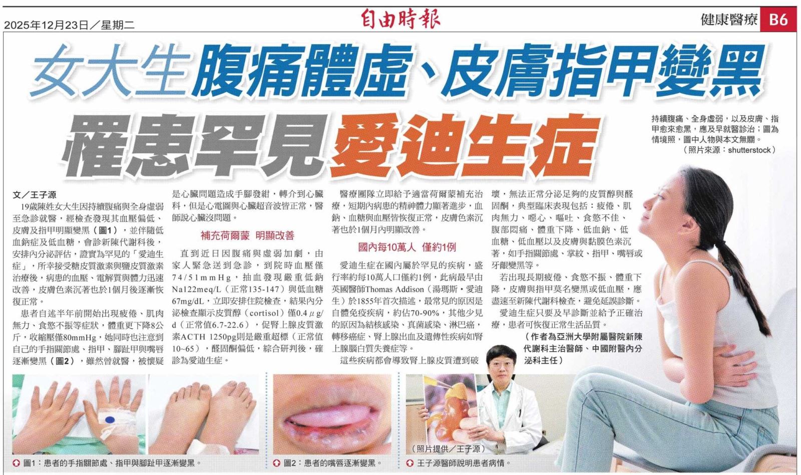 19歲陳姓女大生因持續腹痛與全身虛弱至急診就醫,經檢查發現其血壓偏低、皮膚及指甲明顯變黑,並伴隨低鈉血症及低血糖,會診新陳代謝科後安排內分泌評估,證實為罕見的愛迪生症,所幸接受糖皮質激素與鹽皮質激素治療後,病患血壓、電解質與體力迅速改善,皮膚色素沉著也於一個月後逐漸恢復正常。